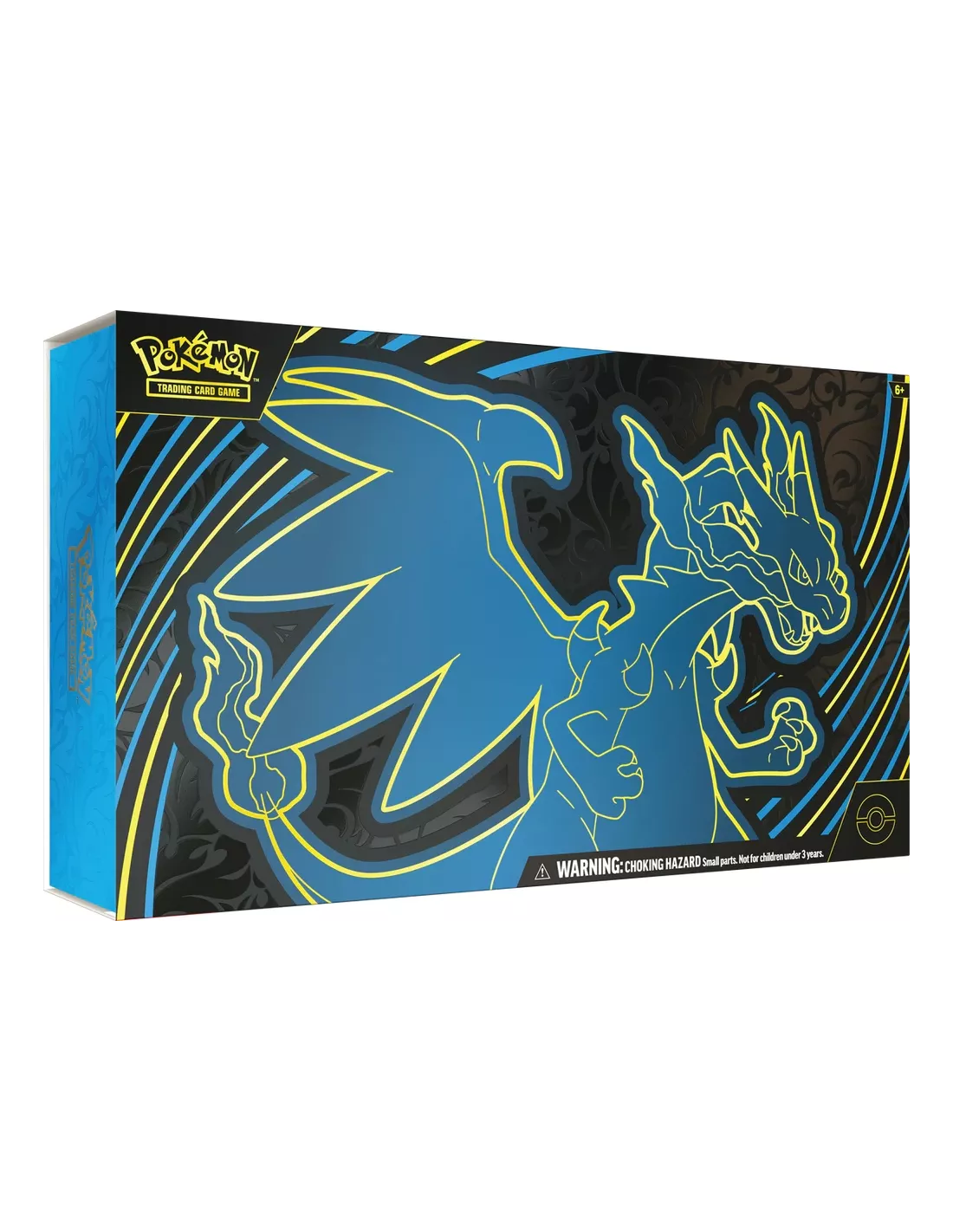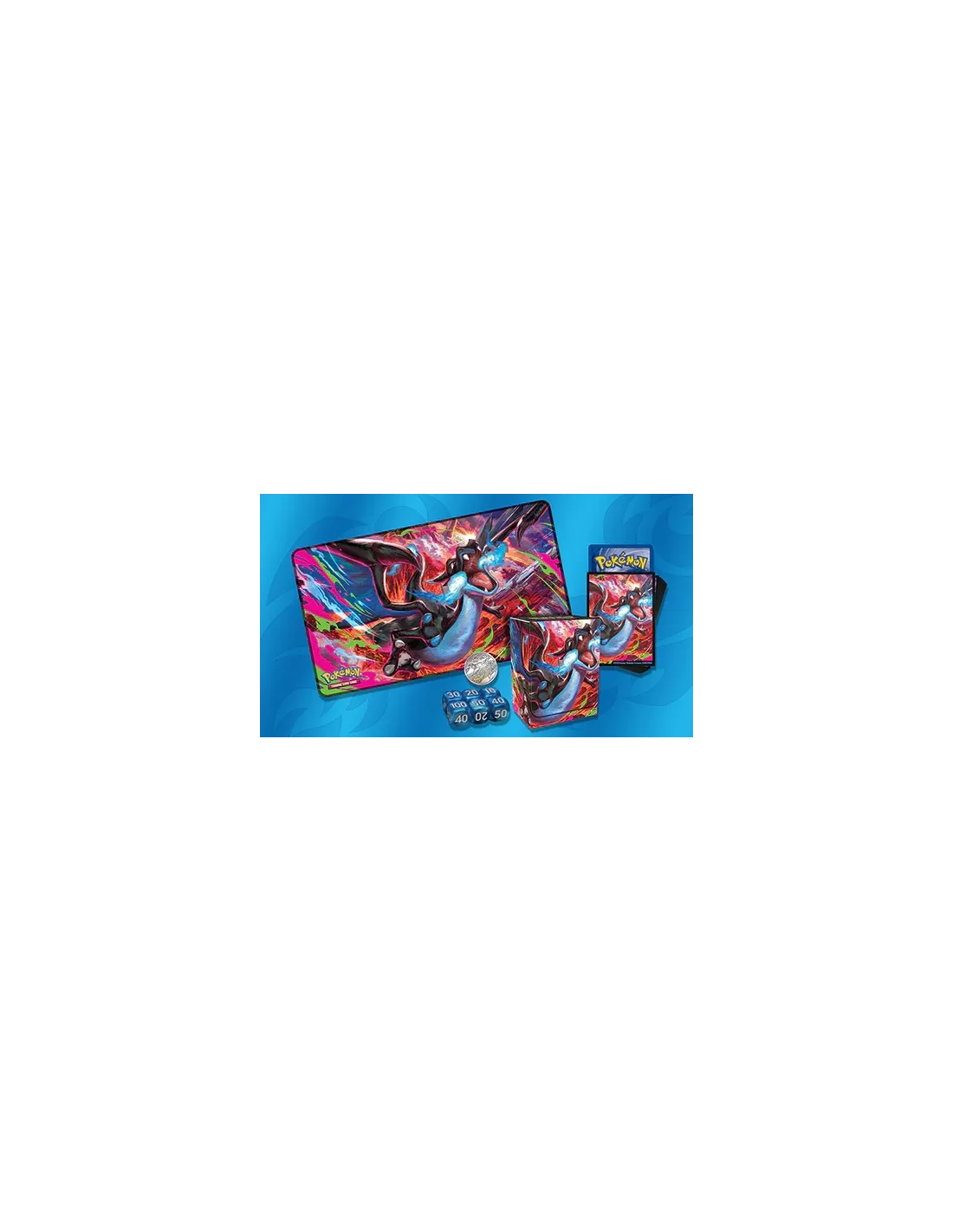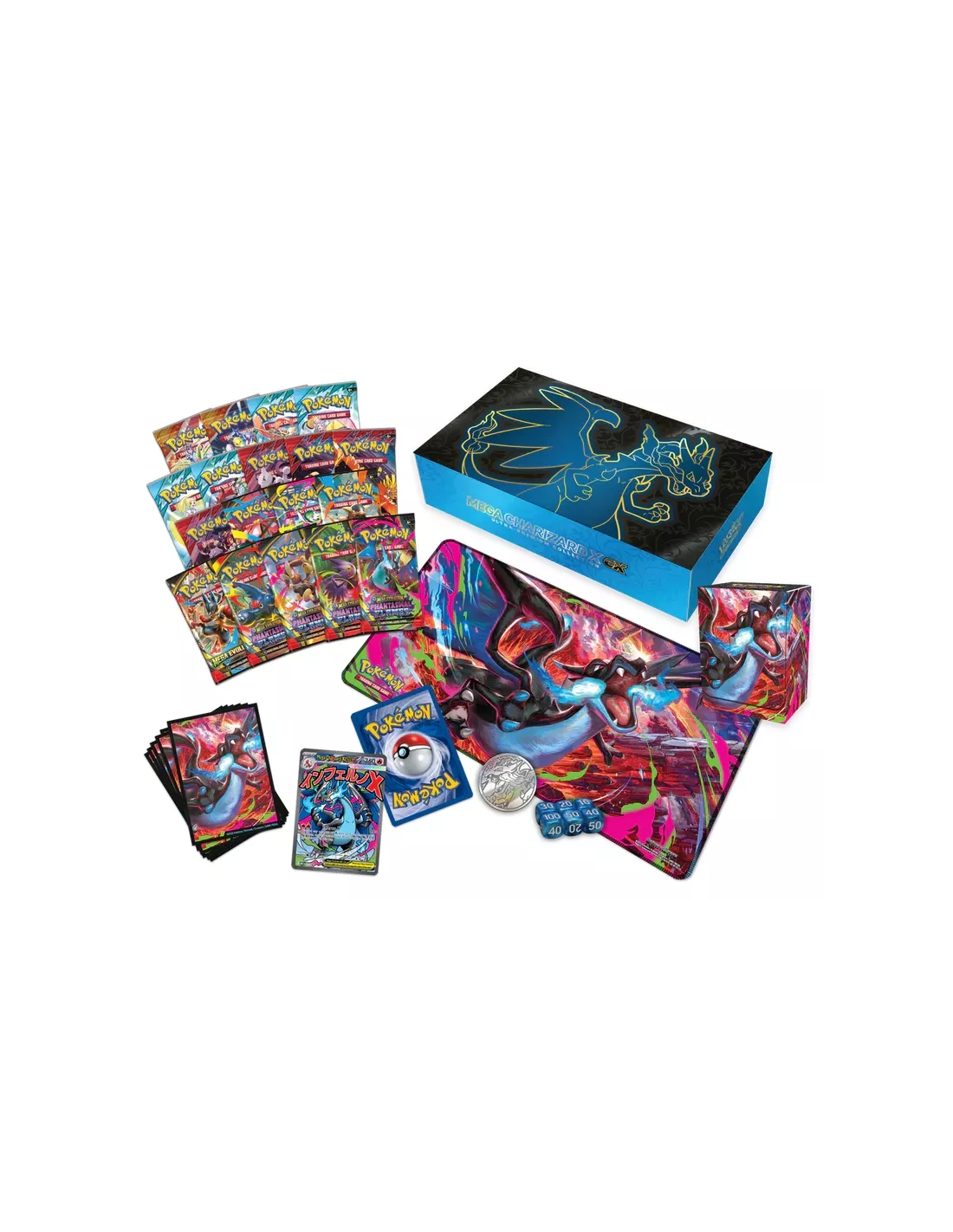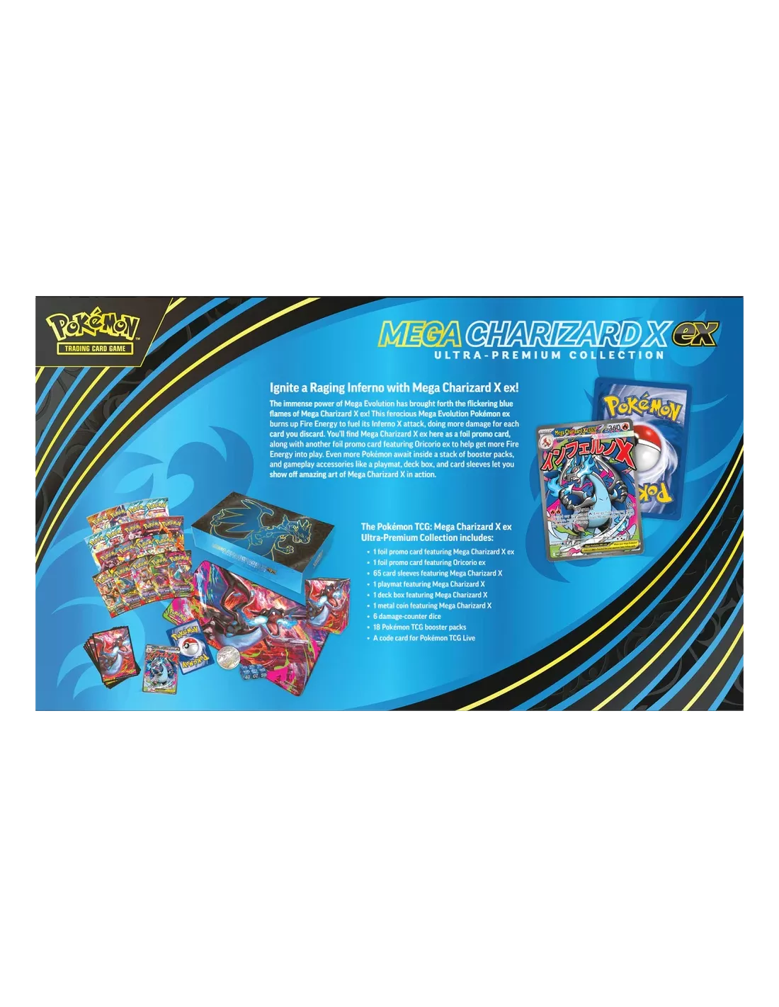 ¡El inmenso poder de la llamarada fantasmal llega de colores azules con Mega-Charizard X ex! Este feroz Pokémon ex Megaevolución consume Energía Fuego para avivar su ataque Infierno X, aumentando su daño con cada carta que descartes. Mega-Charizard X ex llega en forma de carta promo holográfica junto a Oricorio ex, también como carta promo holográfica, que te ayudará a poner más Energía Fuego en juego. Encontrarás muchos más Pokémon dentro del montón de boosters, y te destacarás en el combate gracias a los accesorios, entre ellos 1 tapete, 1 portamazo y fundas para cartas con la intensa ilustración de Mega-Charizard X en acción.